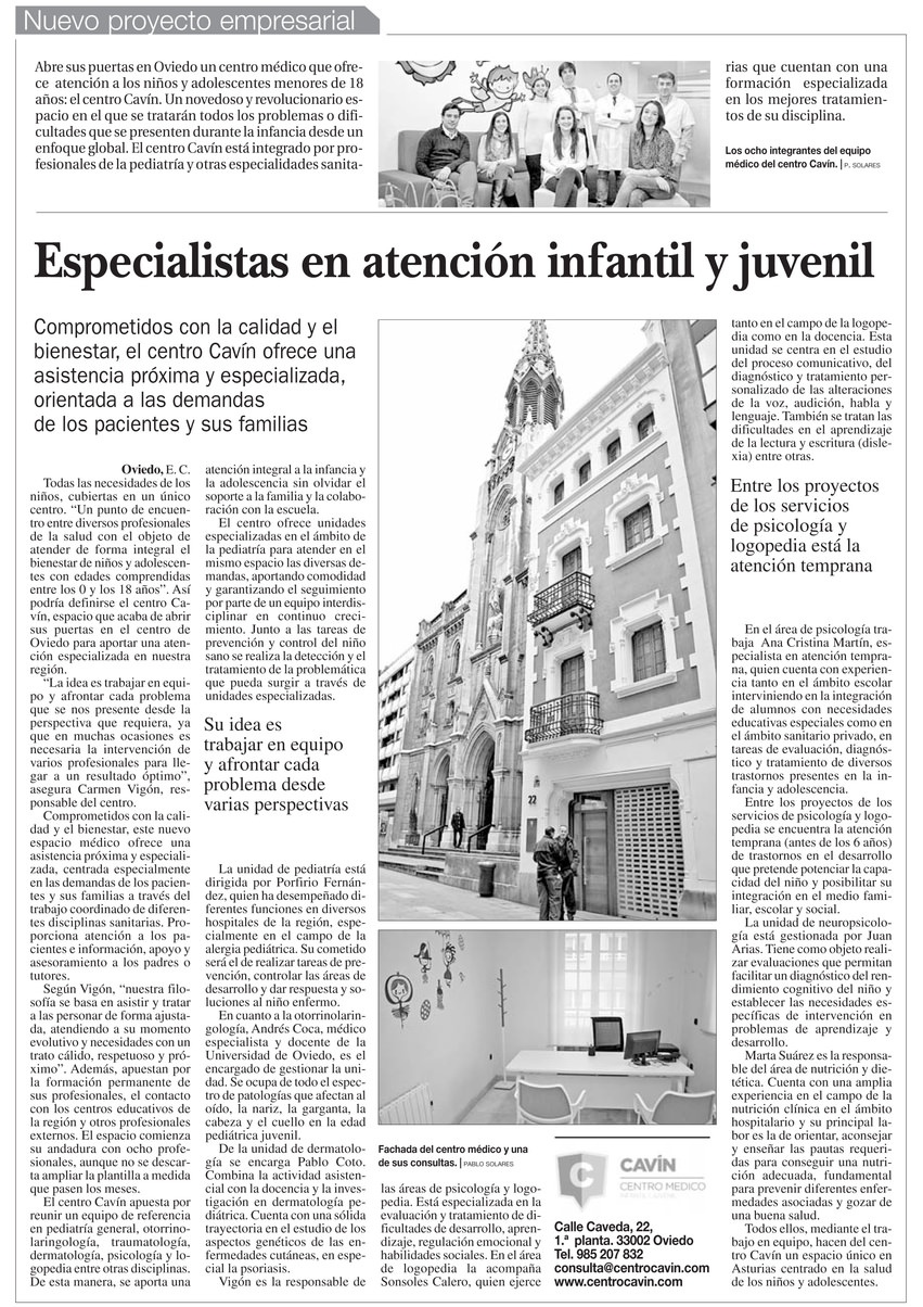 Os invitamos a leer el reportaje publicado en el periódico La Nueva España con motivo de la apertura de Cavín - Centro Médico Infantil y Juvenil. Describe brevemente cada una de las especialidades que oferta el centro y destaca la asistencia cercana y especializada de los profesionales que lo forman.